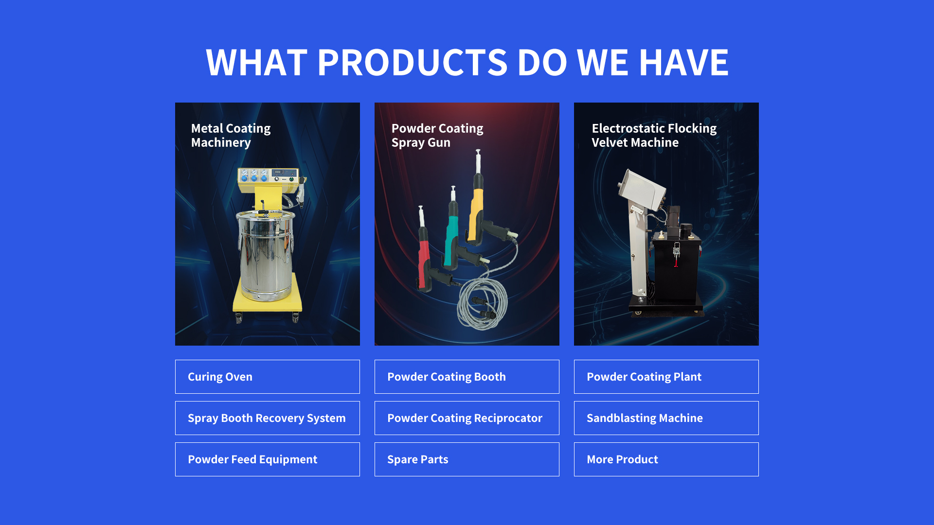 Finish Line Powder Coating systems are designed for high-efficiency, durable finishes. Key components include an electrostatic spray gun, powder hopper, high-voltage generator, curing oven, and conveyor system.